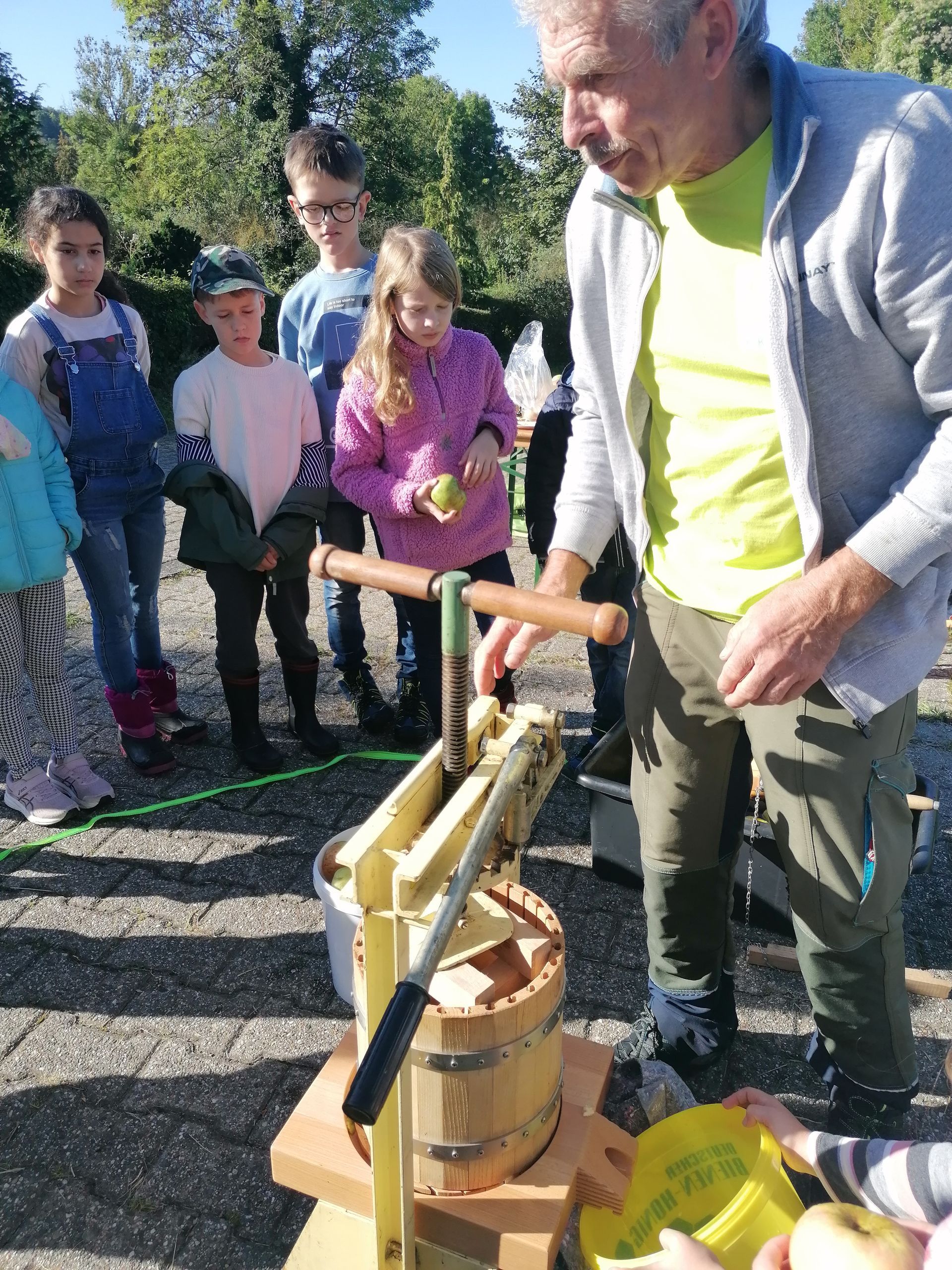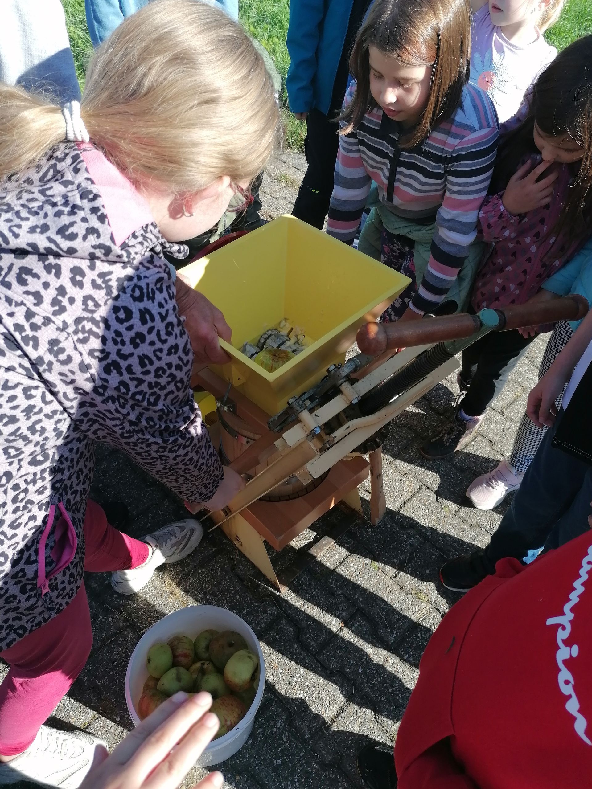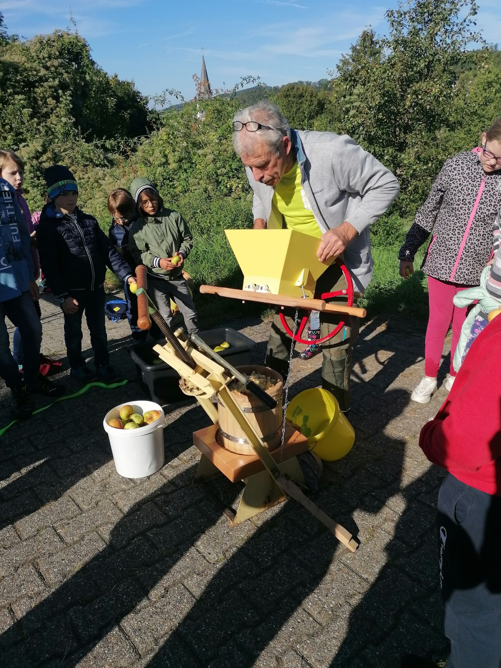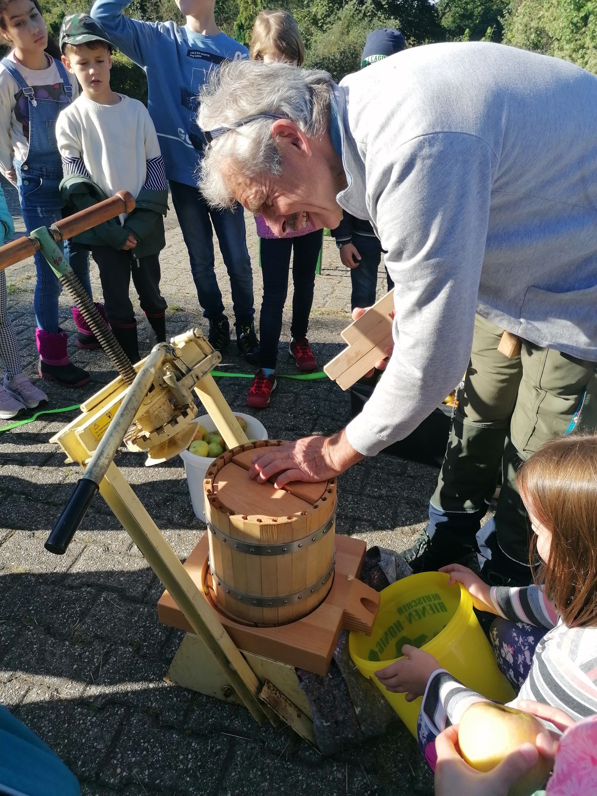 Wir waren auf der Streuobstwiese, um Apfelsaft zu pressen. Wir mussten zuerst die Apfelpresse aufbauen.