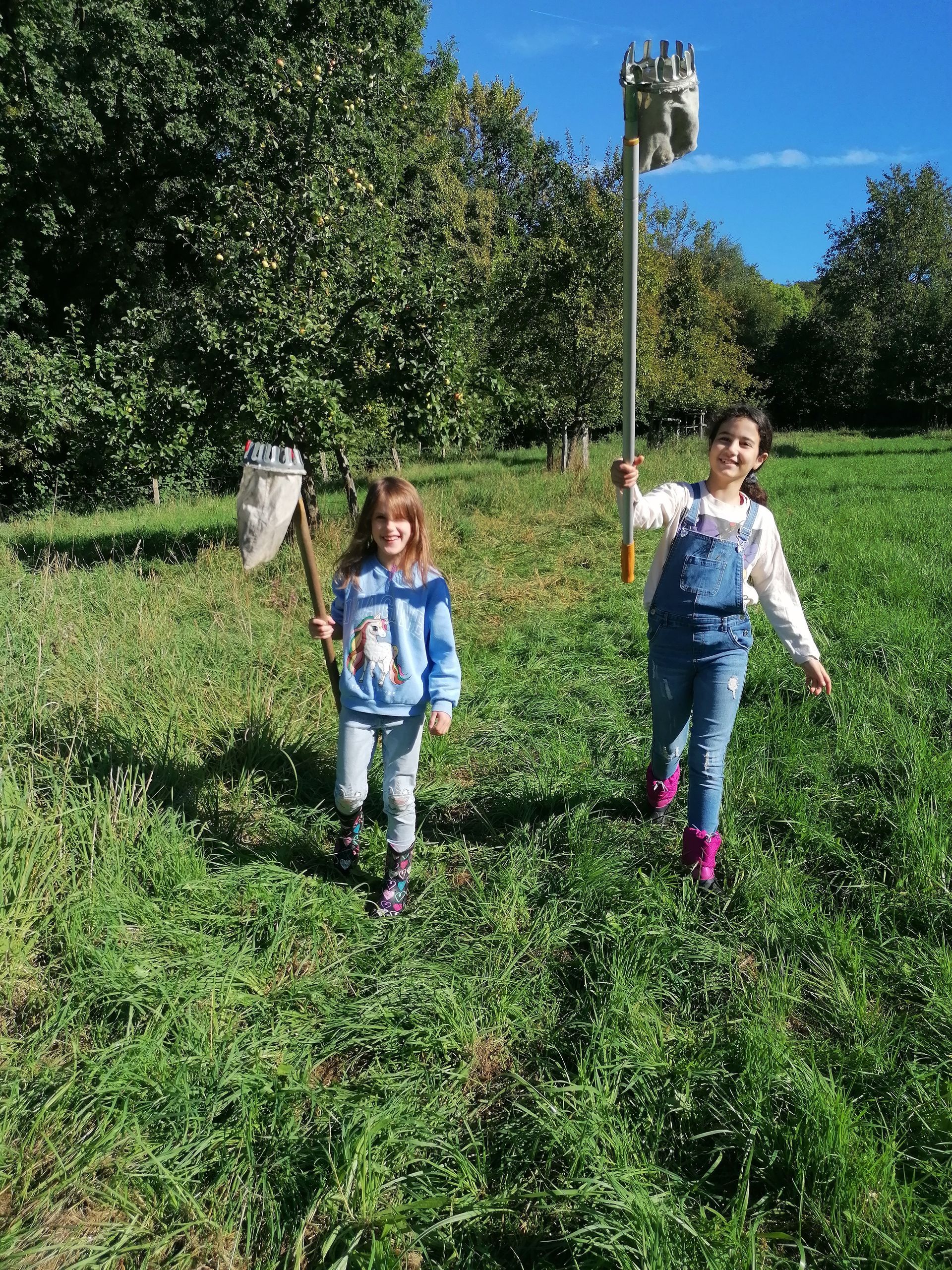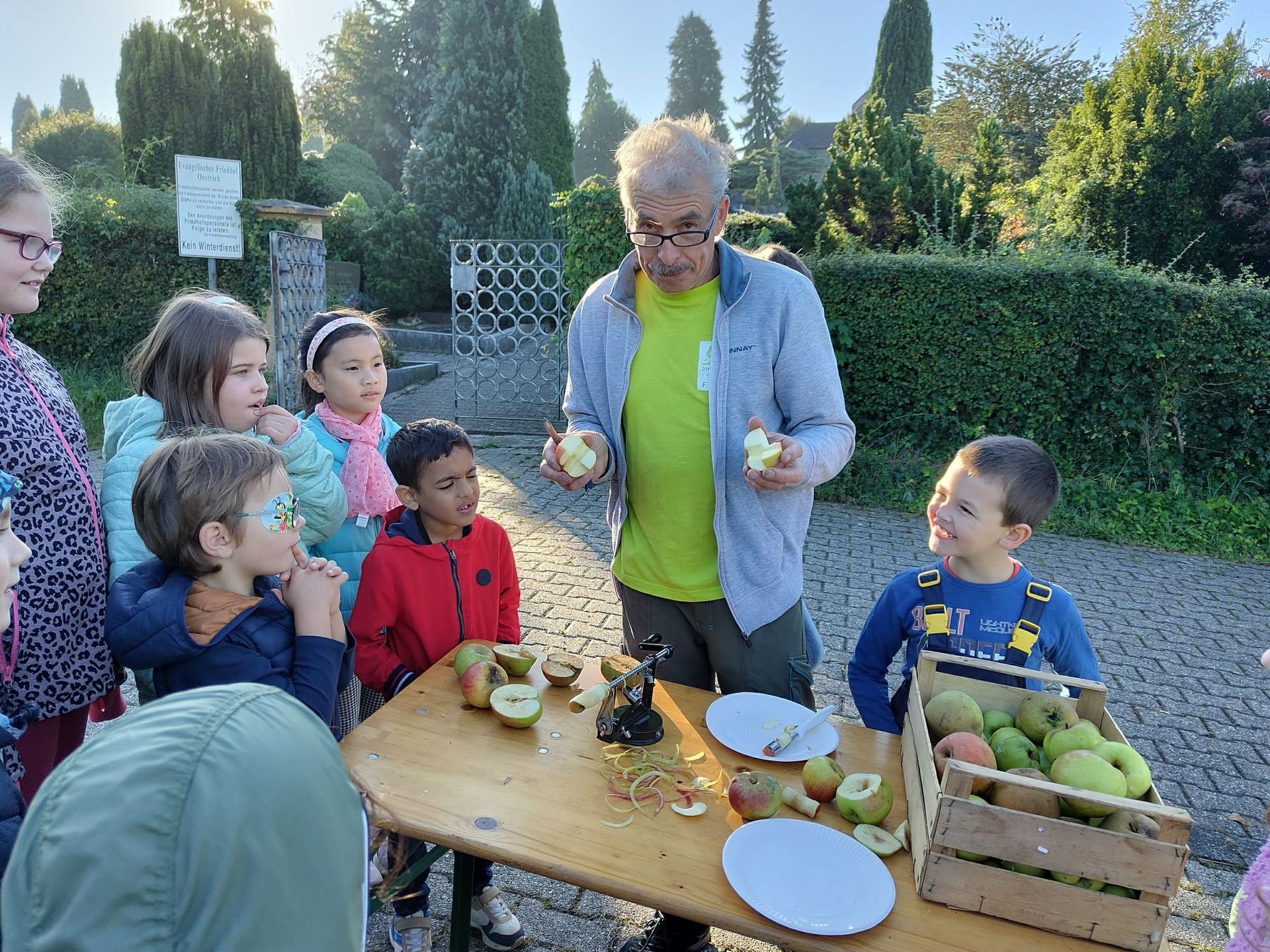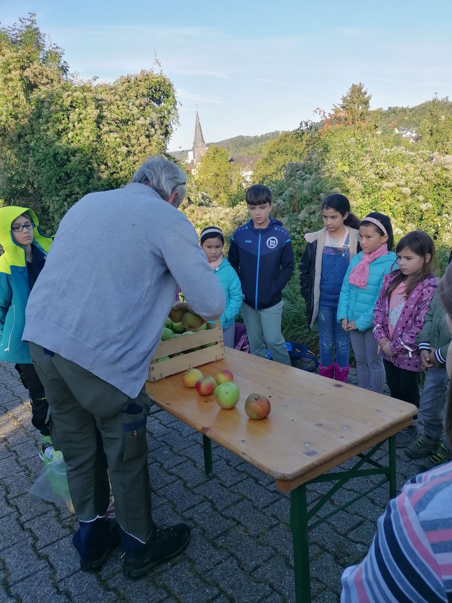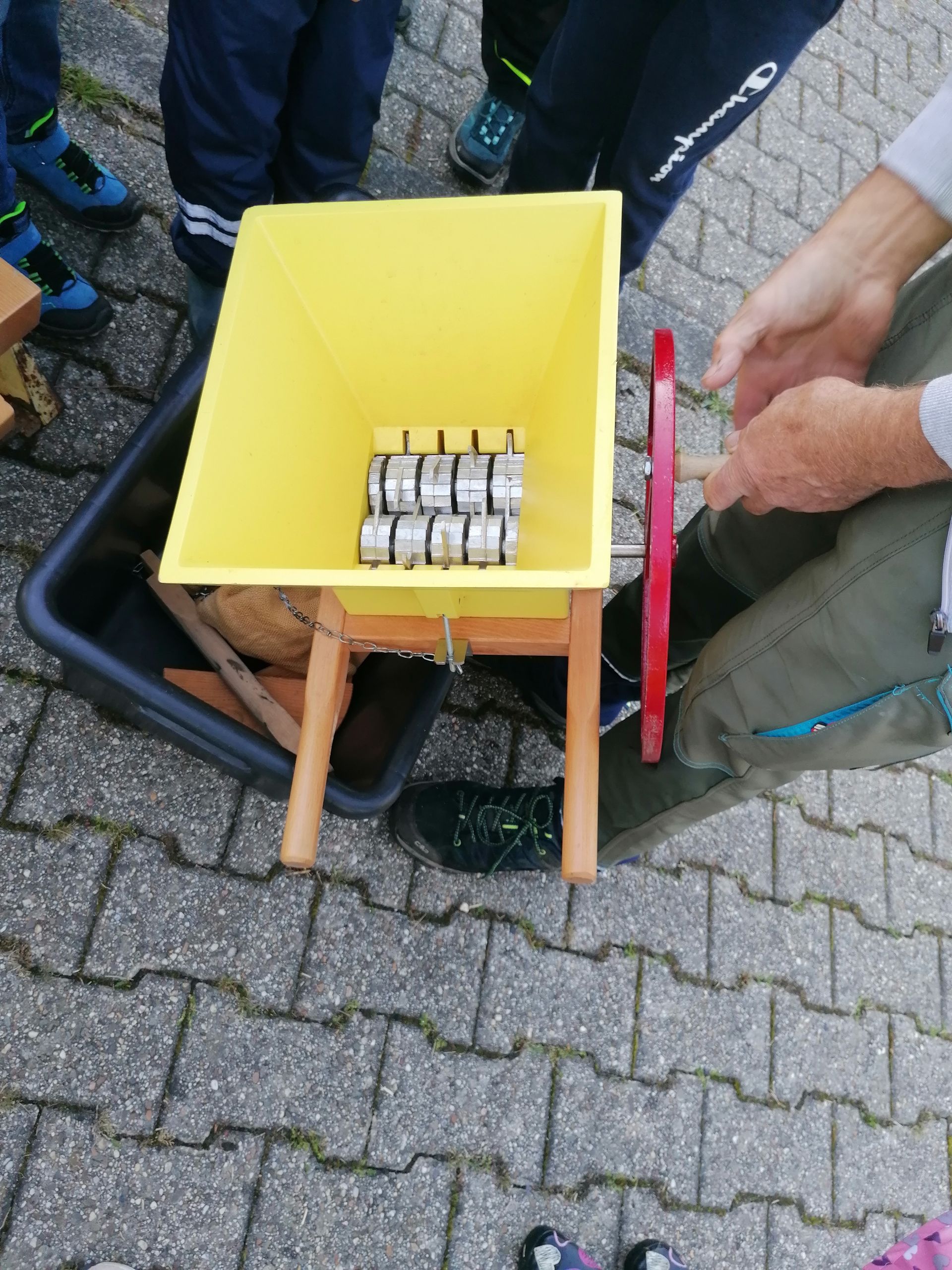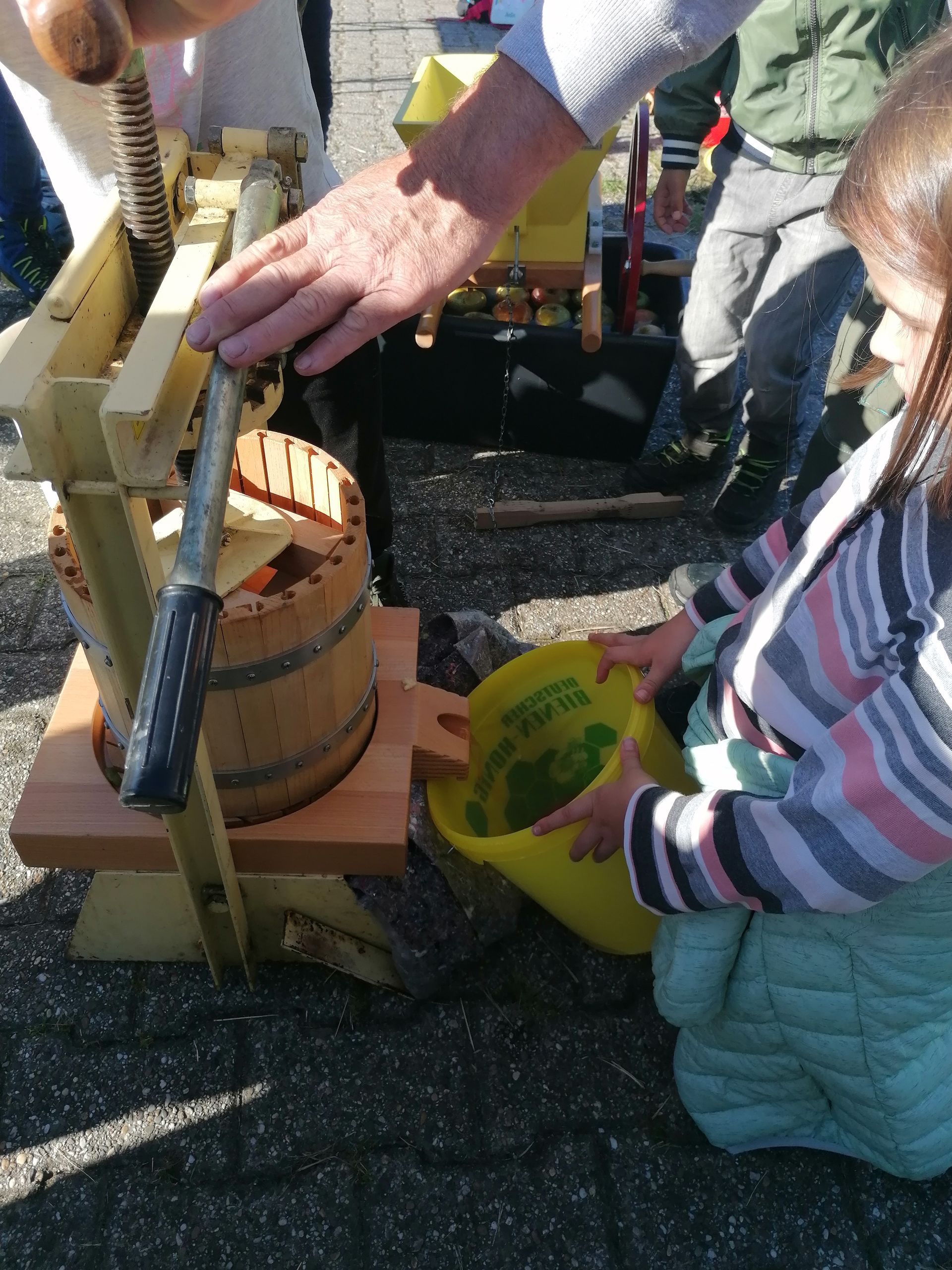 Wir waren auf der Streuobstwiese, um Apfelsaft zu pressen. Wir mussten zuerst die Apfelpresse aufbauen.