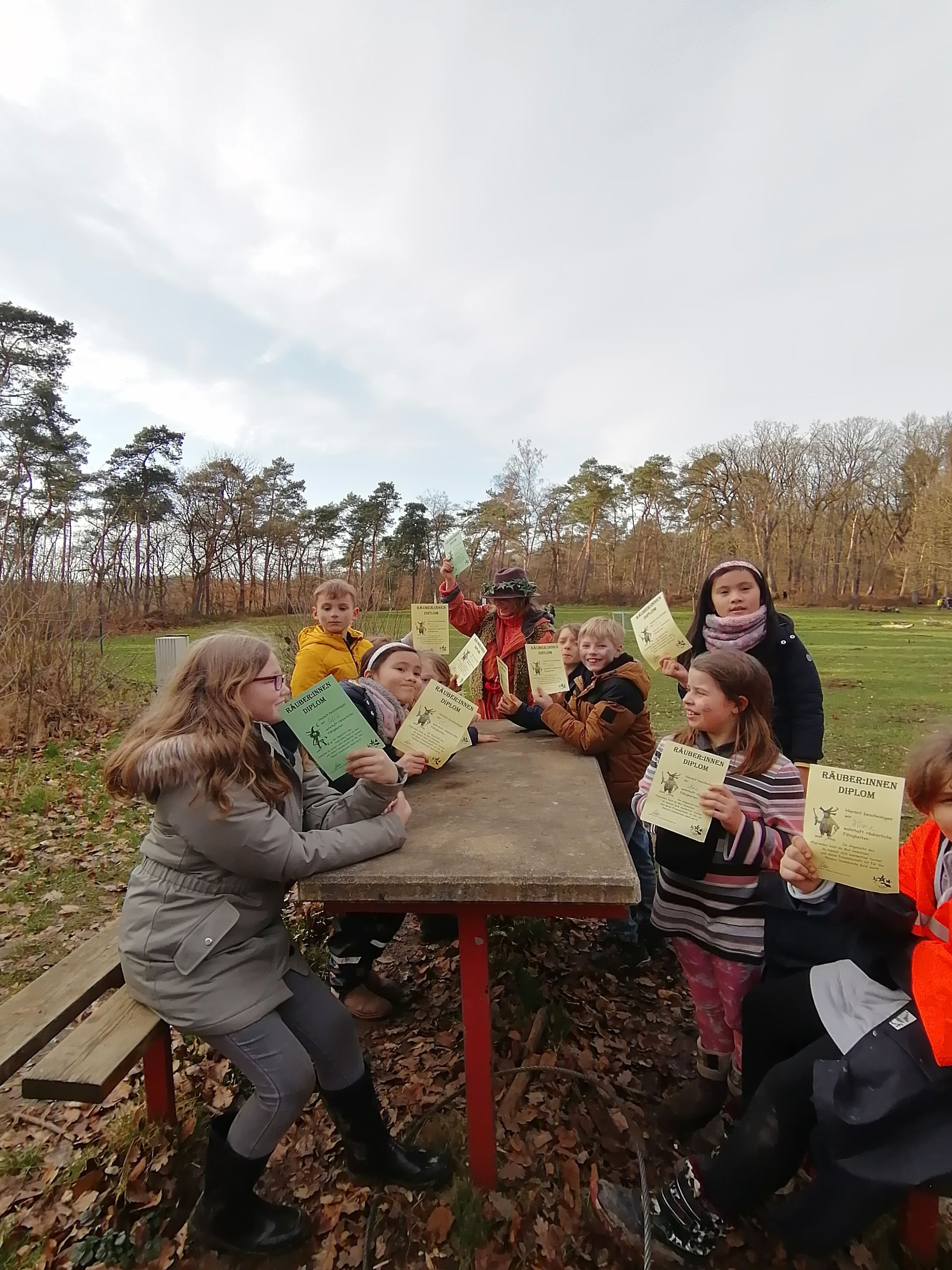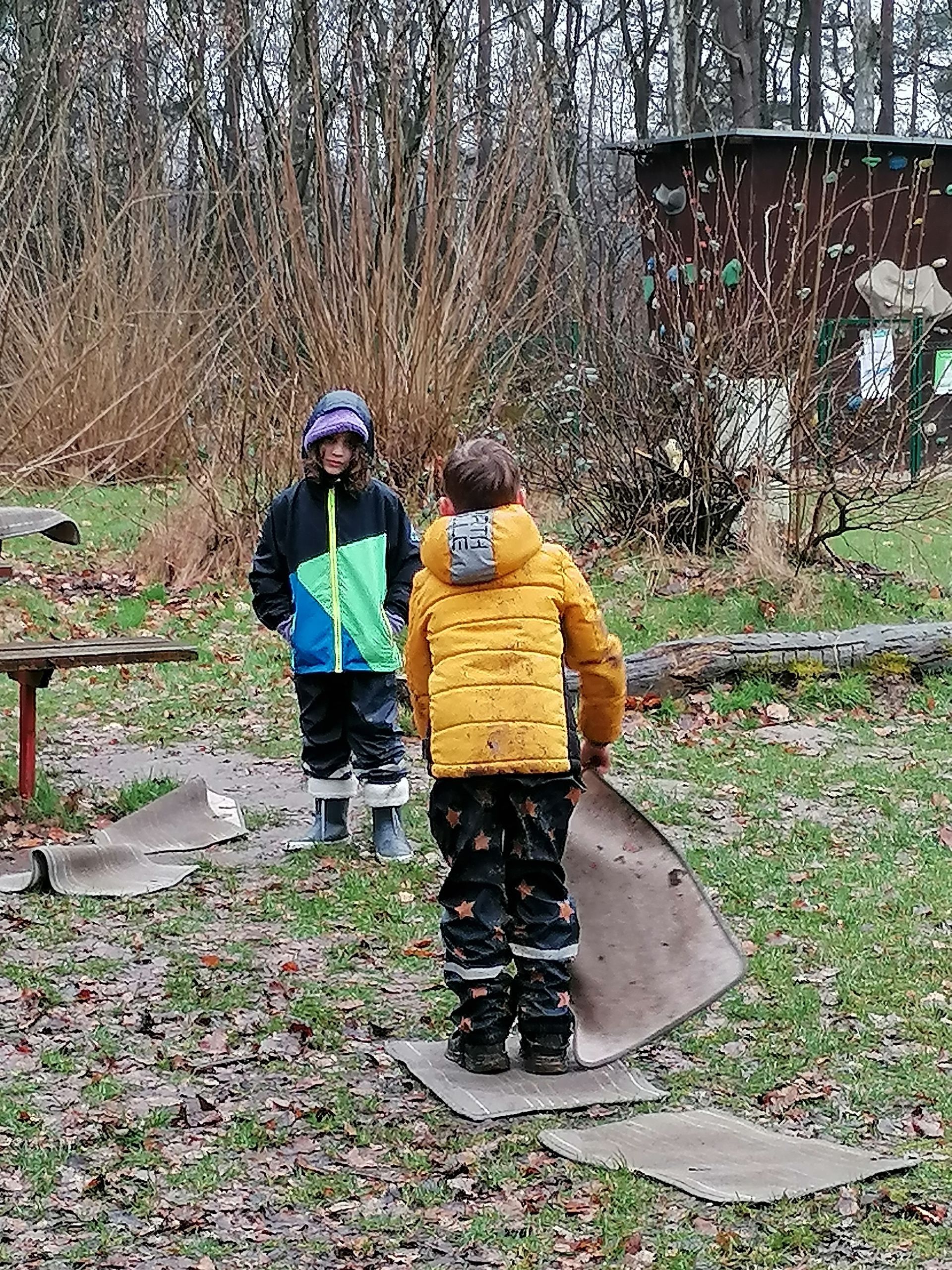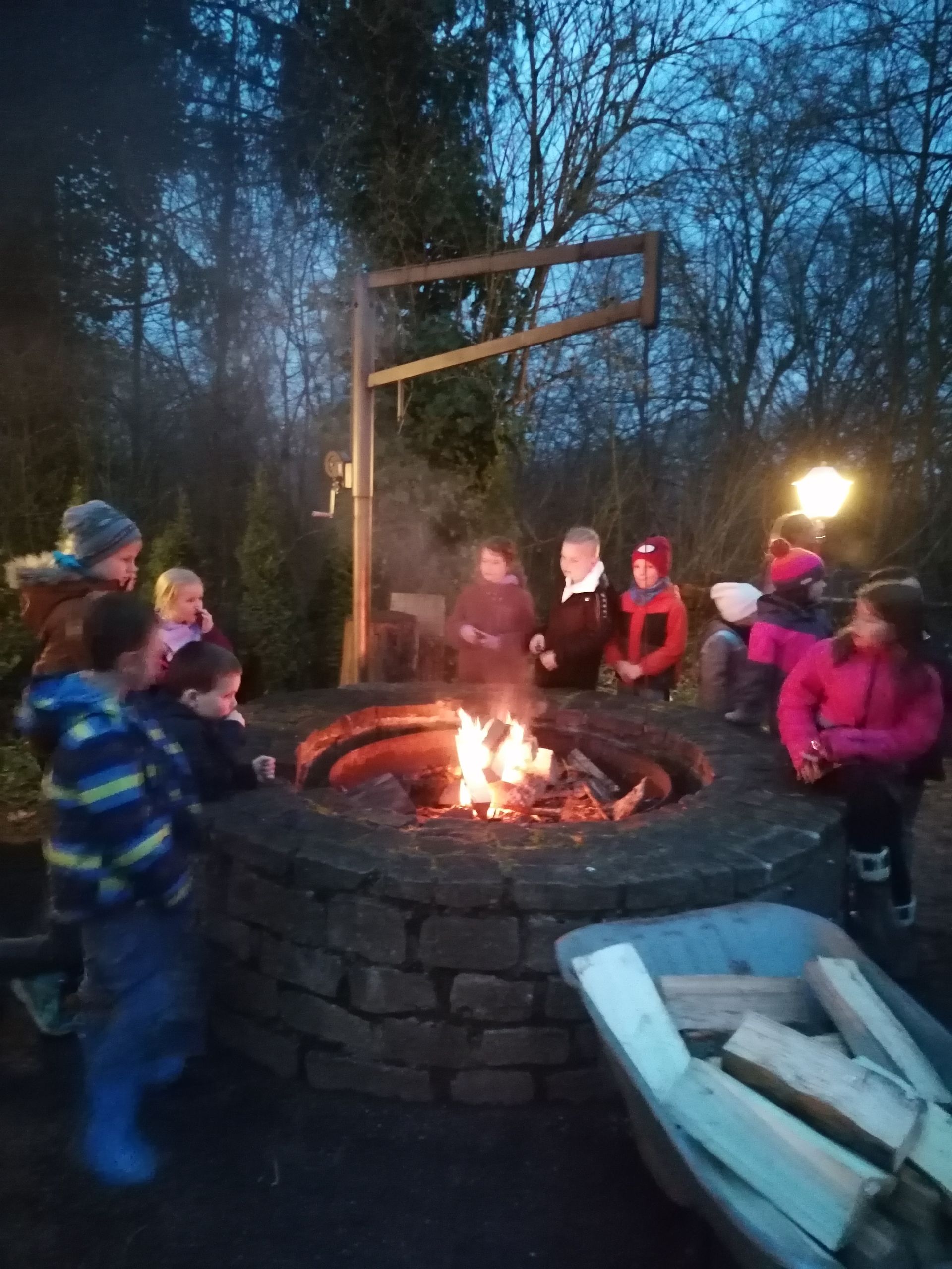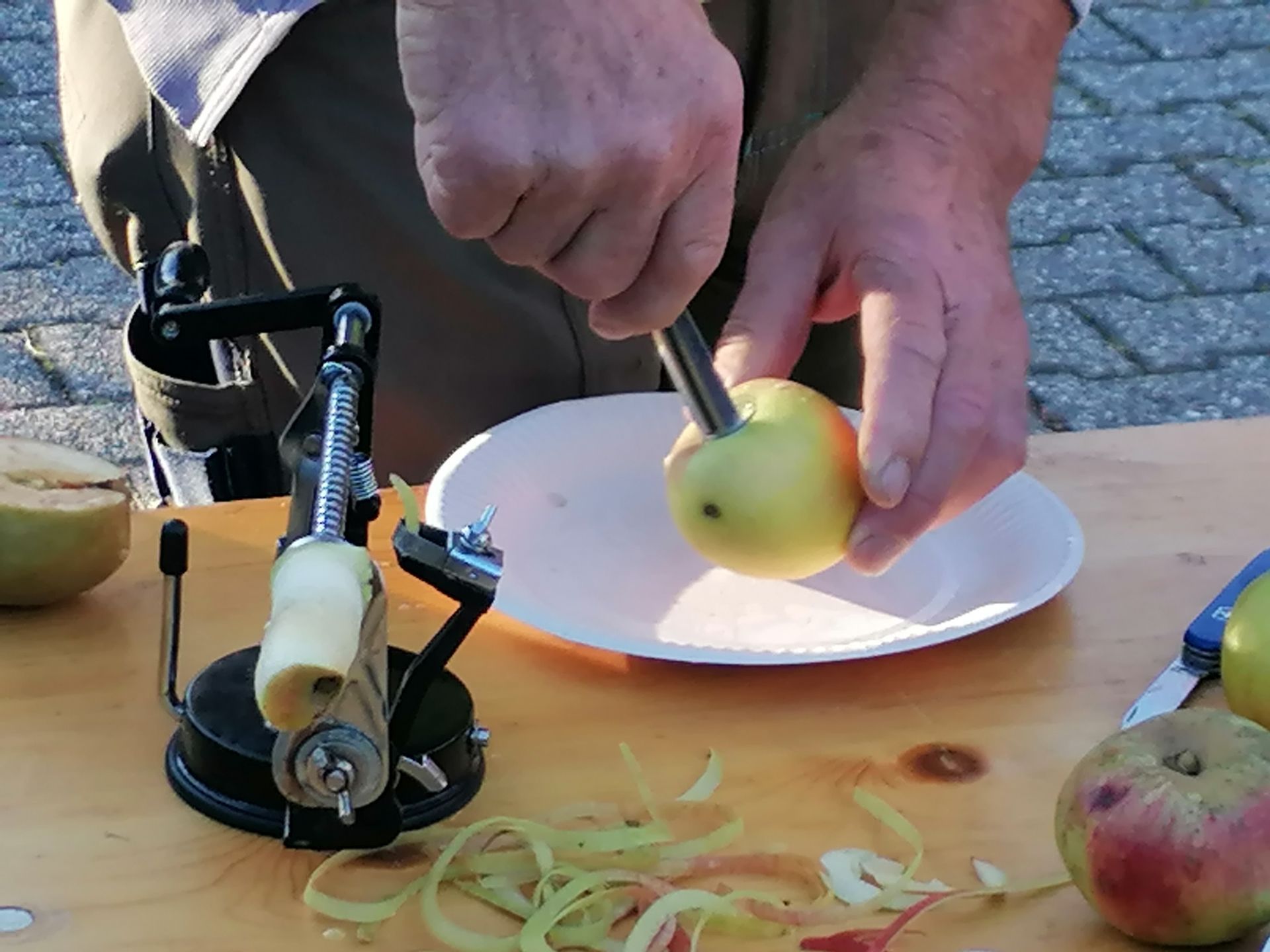 Wir waren auf der Streuobstwiese, um Apfelsaft zu pressen. Wir mussten zuerst die Apfelpresse aufbauen.
