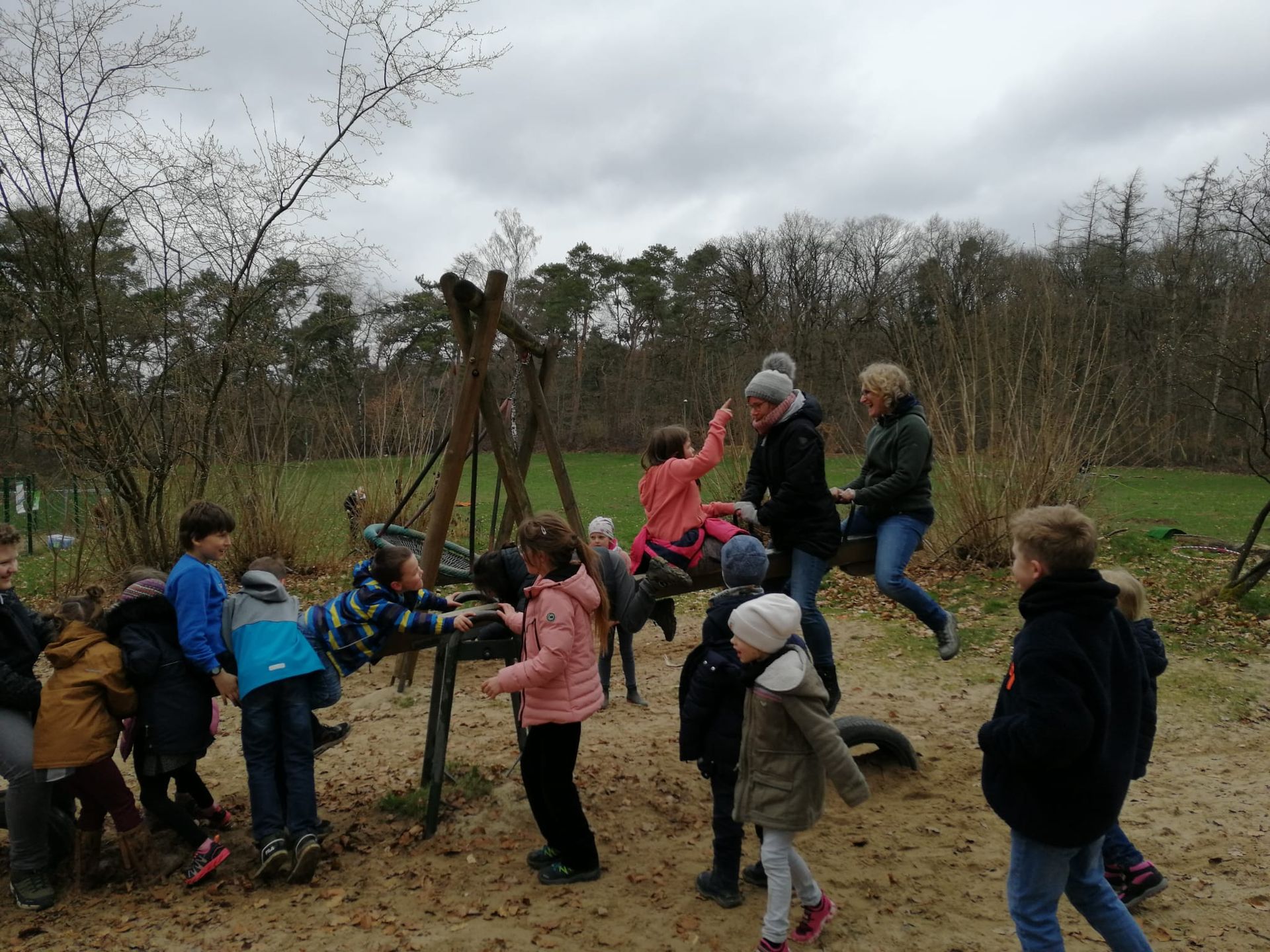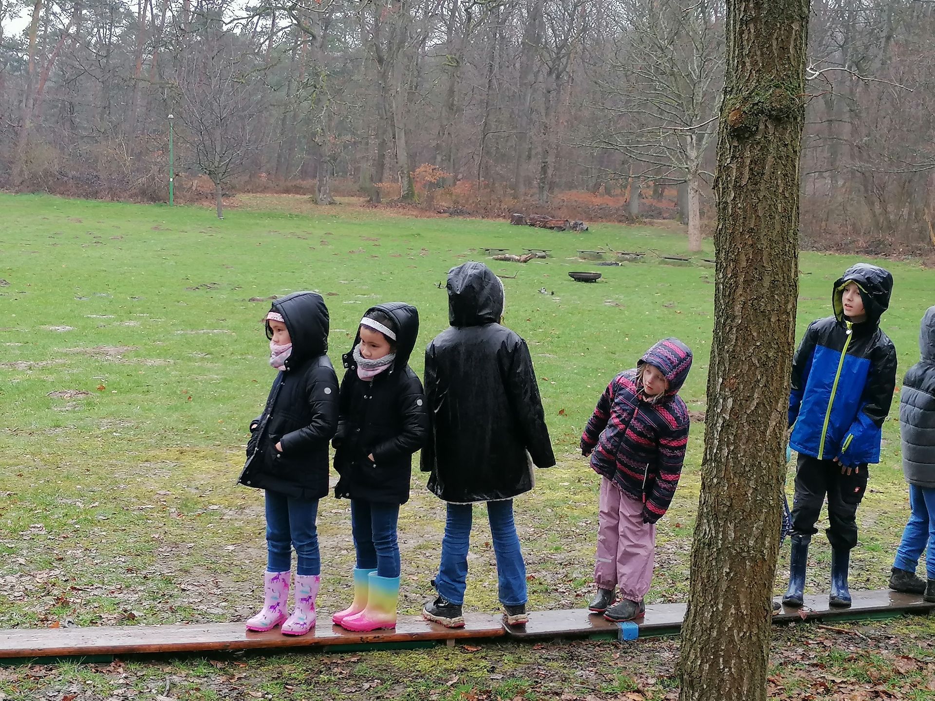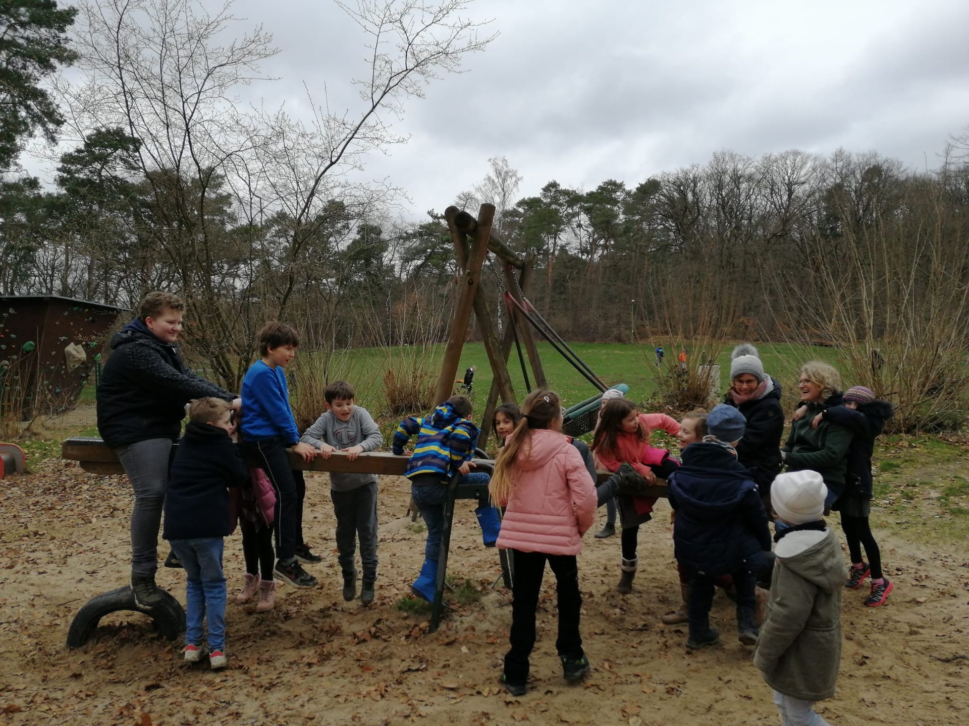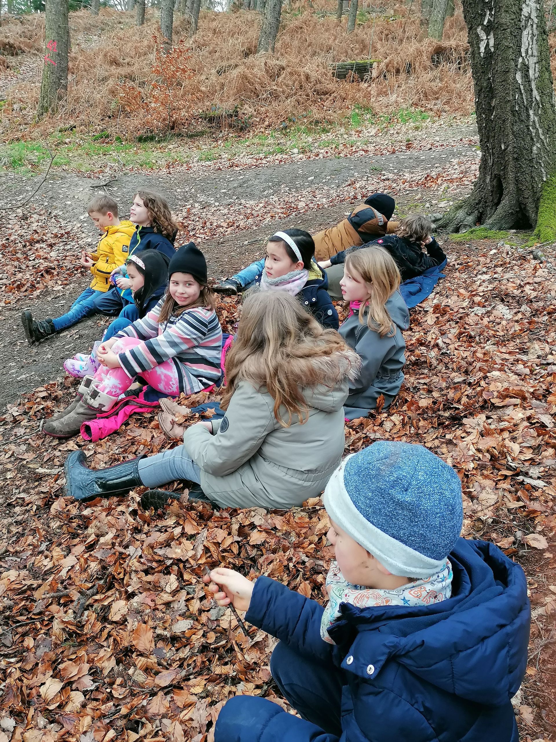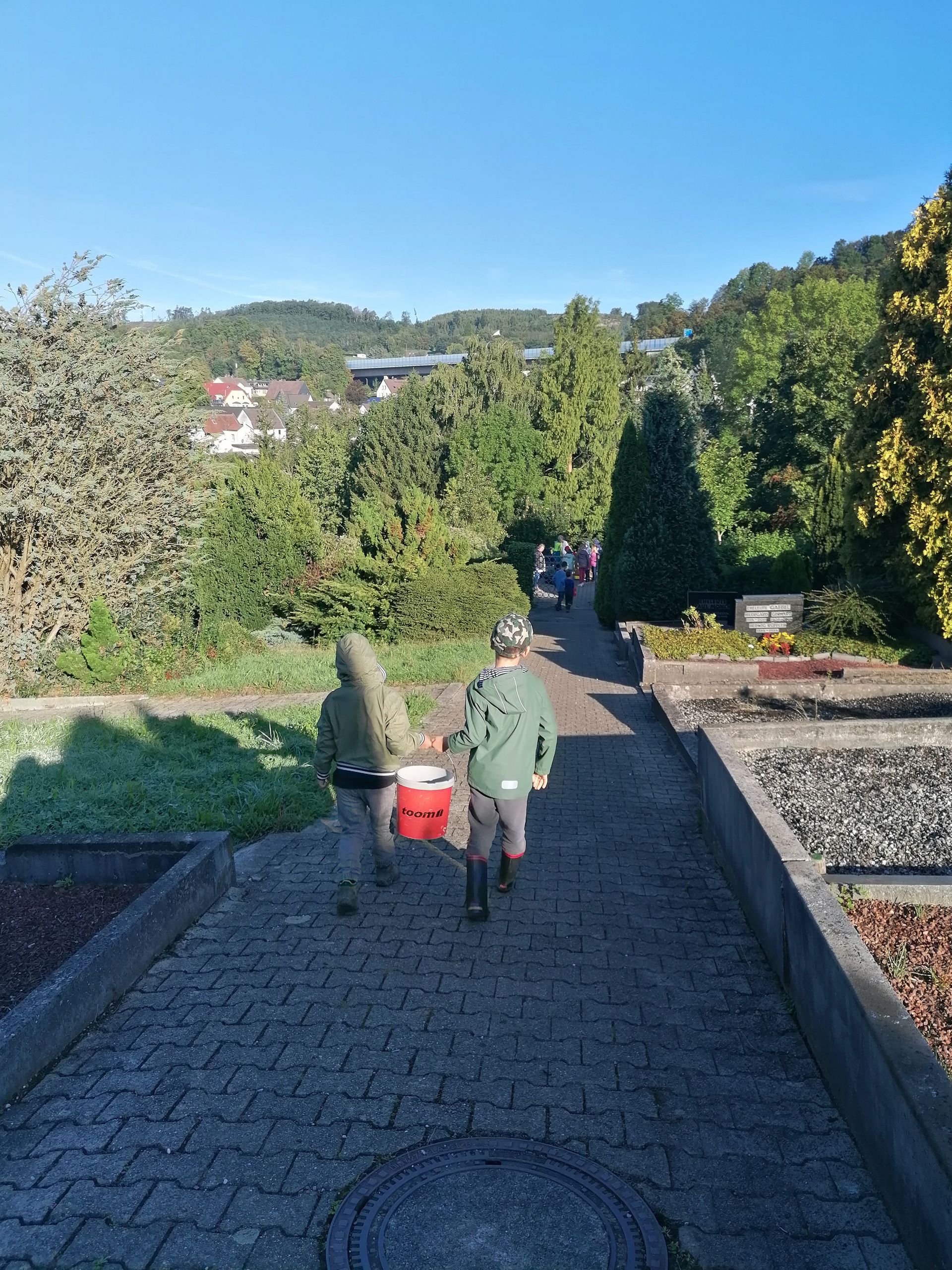 Wir waren auf der Streuobstwiese, um Apfelsaft zu pressen. Wir mussten zuerst die Apfelpresse aufbauen.