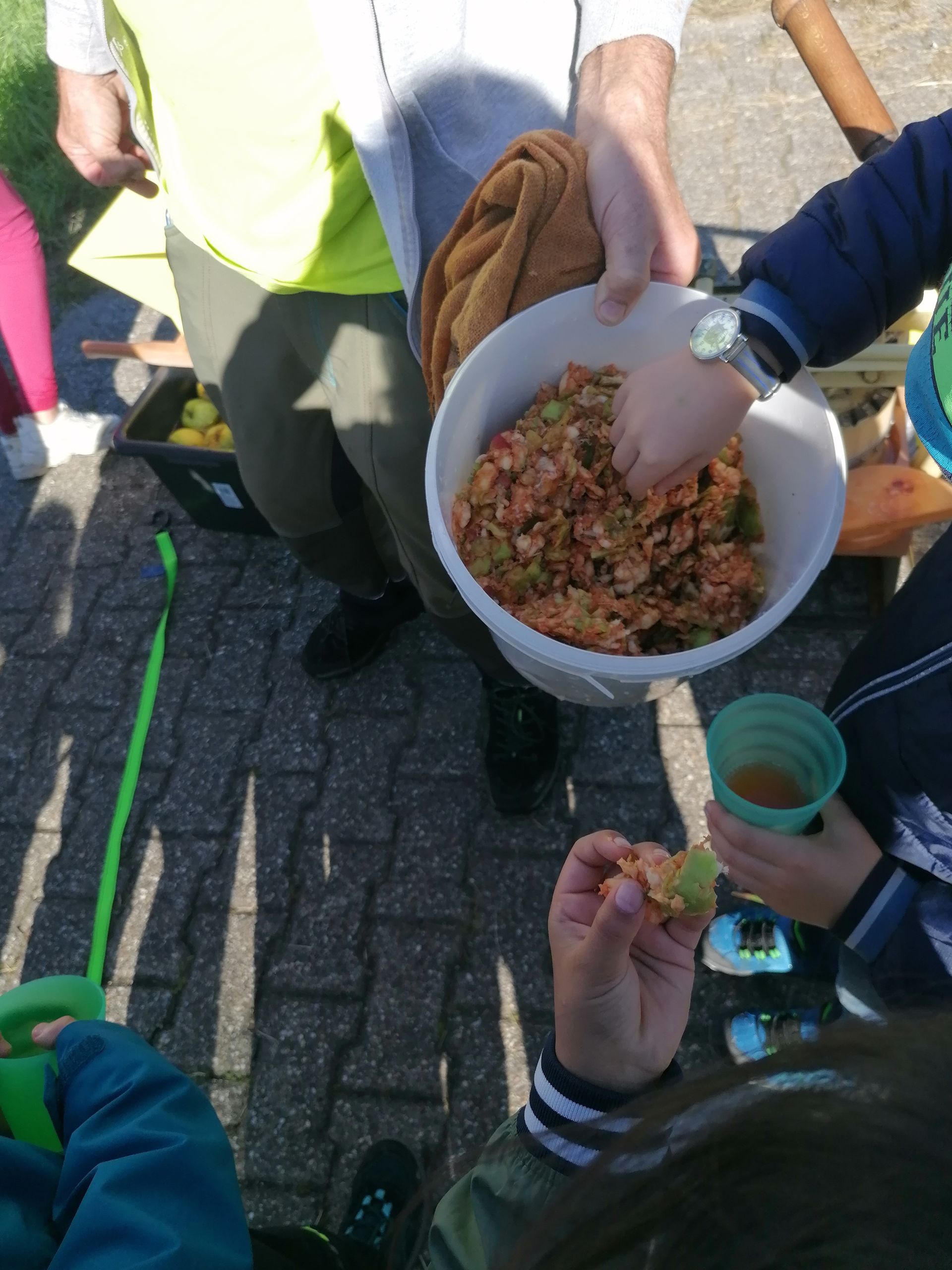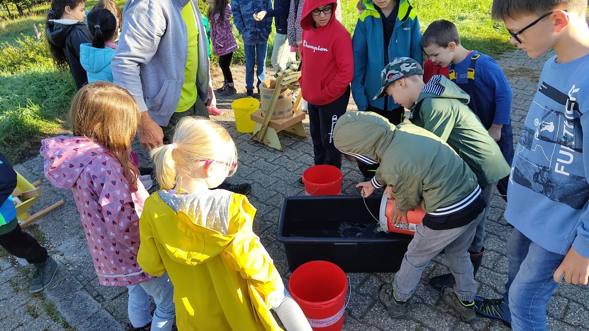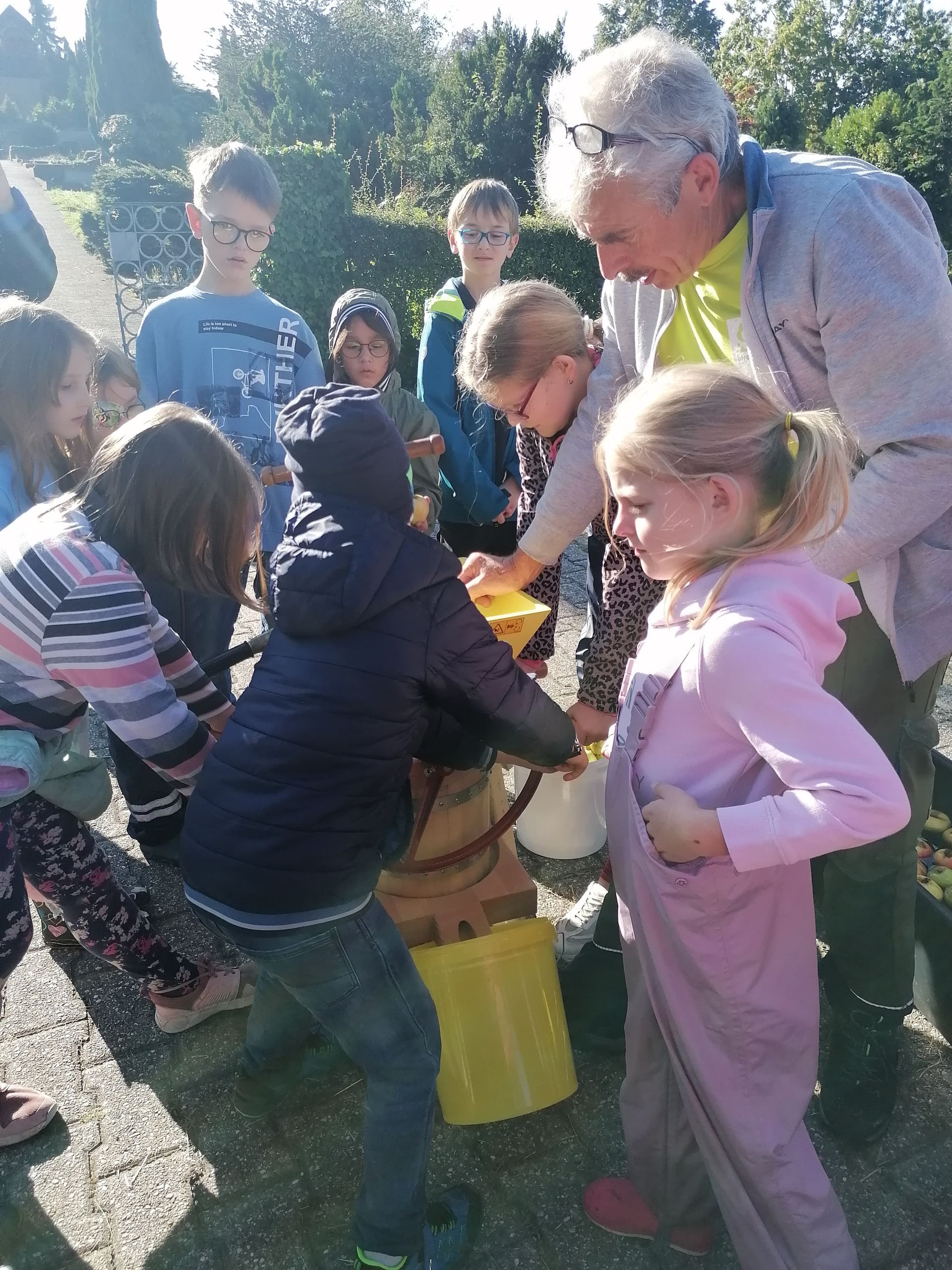Danach holten wir Wasser, um die Äpfel zu waschen. Daraufhin sammelten wir Äpfel vom Boden und pflückten auch welche vom Baum. Zurück bei der Apfelpresse, warfen wir die Äpfel in den Trichter. Dann drehten wir an dem Rad. Dadurch bewegten sich die Messer und die Äpfel wurden zerkleinert. Einige Minuten später entfernte wir den Trichter, denn das Fass war voll. Dann verschlossen wir das Fass. Anschließend setzte Herr Koch die Presse an. Gleich darauf drehte ich an der Presse. Es war ein bisschen schwer, aber der Saft lief. Der Trester blieb übrig. Zum Schluss probierten wir den leckeren Saft.