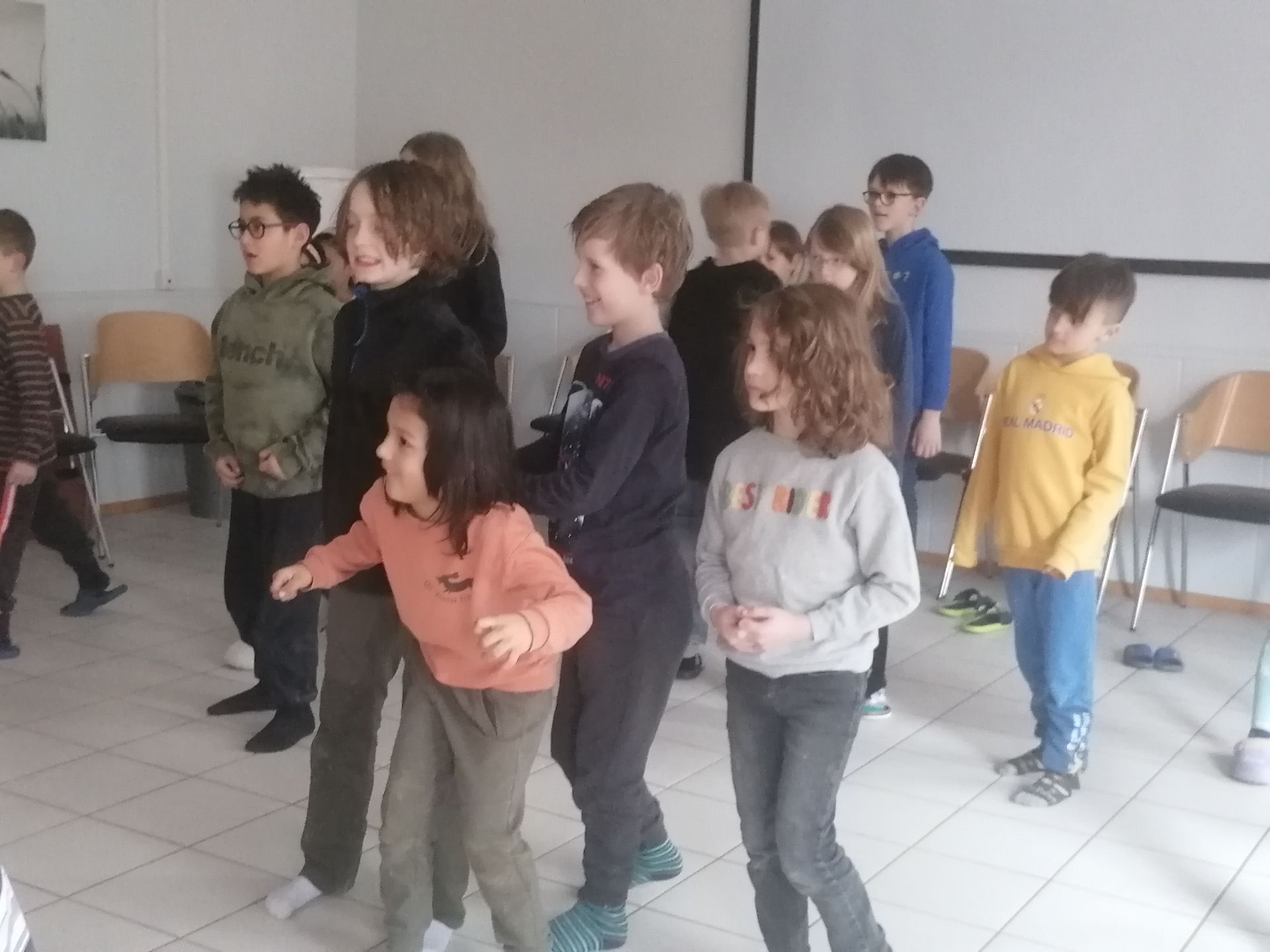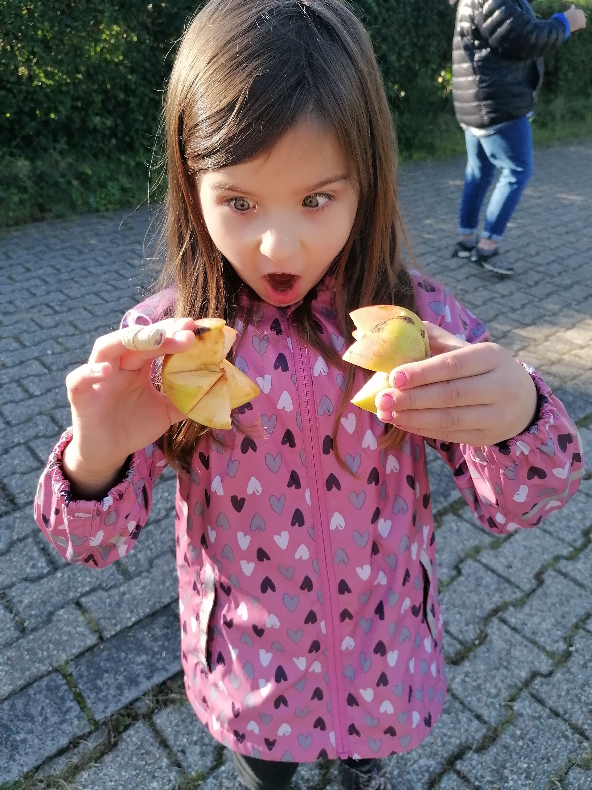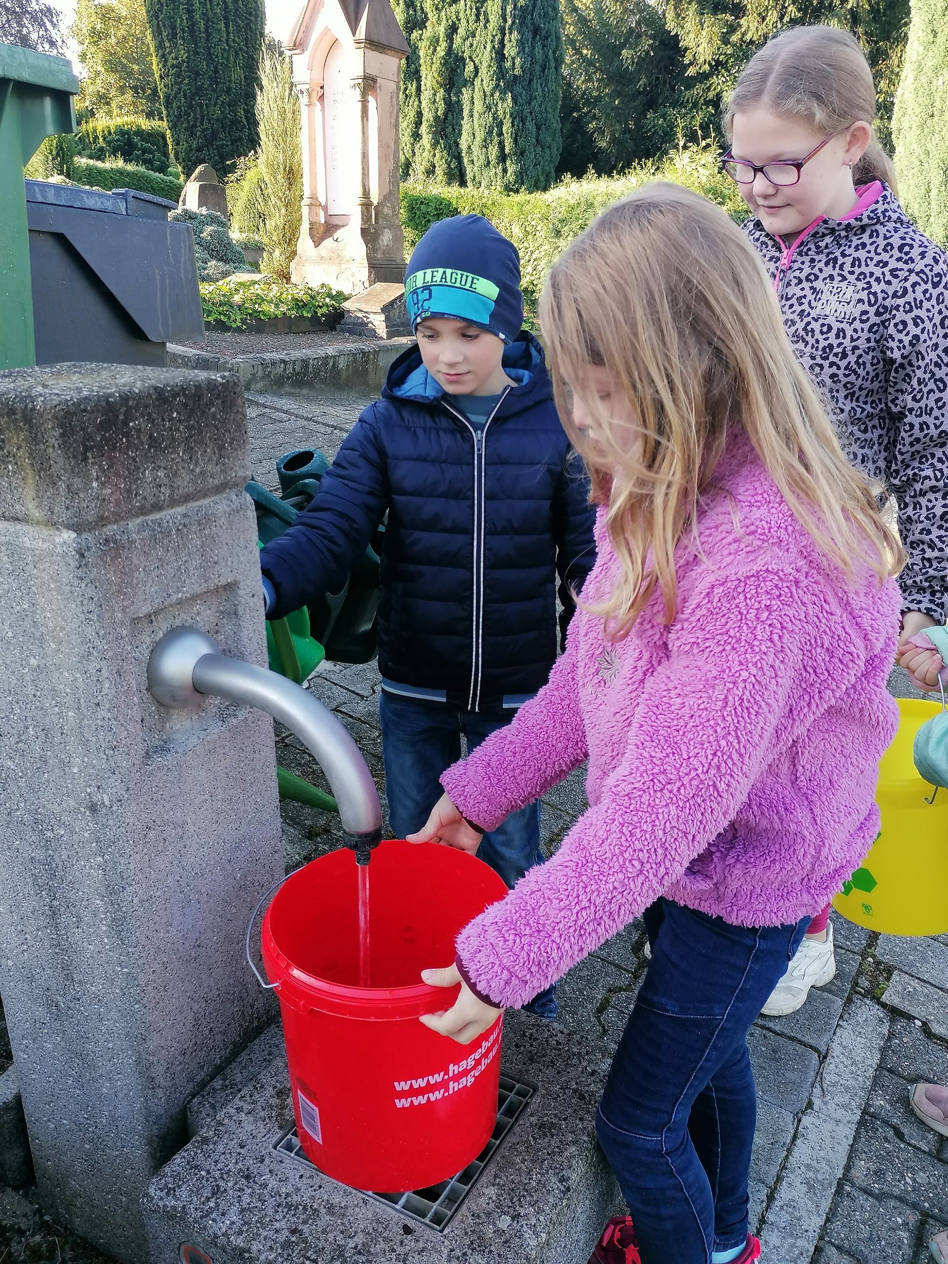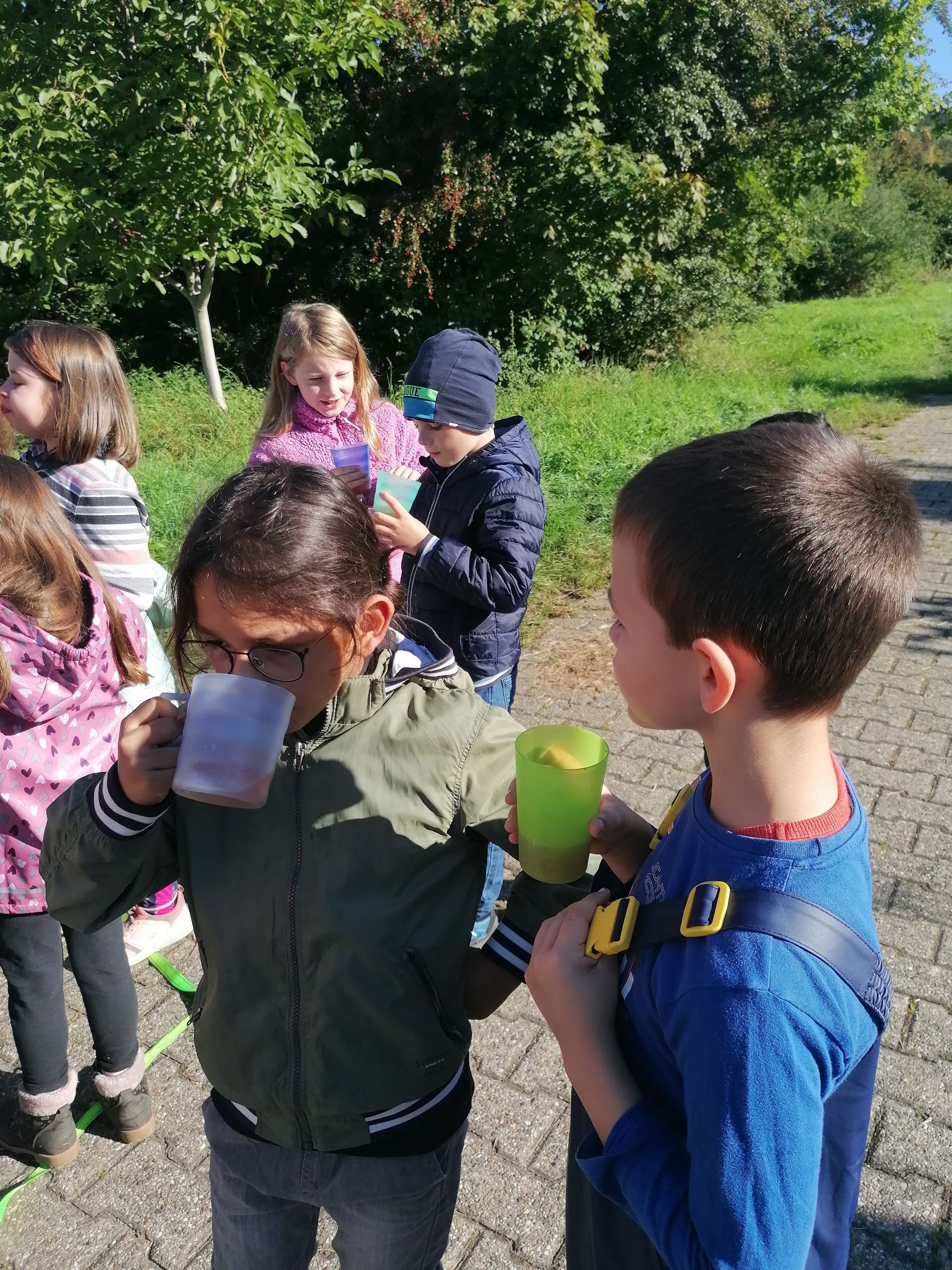Danach holten wir Wasser, um die Äpfel zu waschen. Daraufhin sammelten wir Äpfel vom Boden und pflückten auch welche vom Baum. Zurück bei der Apfelpresse, warfen wir die Äpfel in den Trichter. Dann drehten wir an dem Rad. Dadurch bewegten sich die Messer und die Äpfel wurden zerkleinert. Einige Minuten später entfernte wir den Trichter, denn das Fass war voll. Dann verschlossen wir das Fass. Anschließend setzte Herr Koch die Presse an. Gleich darauf drehte ich an der Presse. Es war ein bisschen schwer, aber der Saft lief. Der Trester blieb übrig. Zum Schluss probierten wir den leckeren Saft.