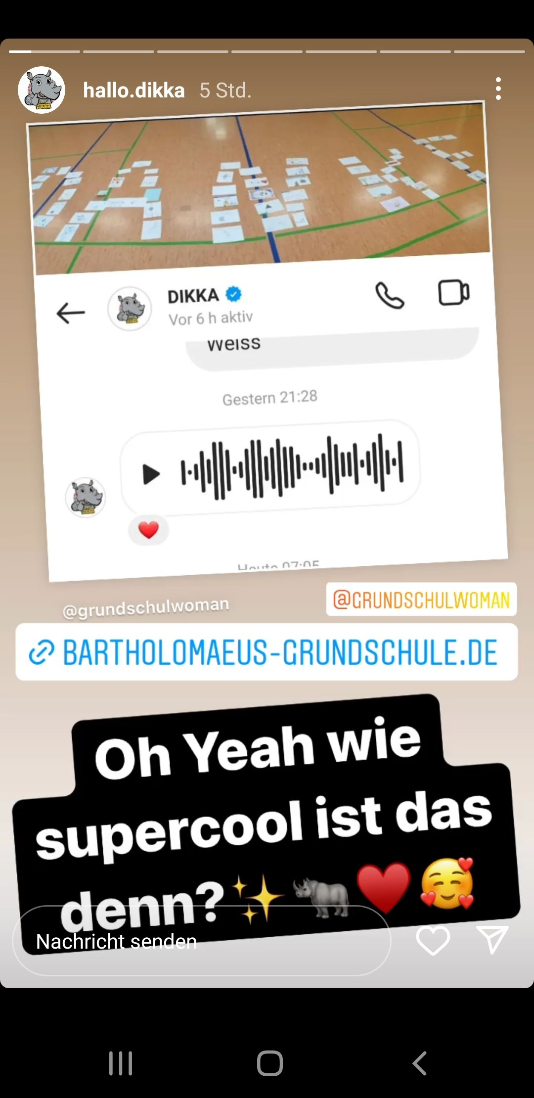 Im Musikunterricht haben wir uns mit dem Thema: Popsongs und ihr Aufbau beschäftigt. Besonders in den Fokus genommen wurde der Song: Boom Schakkalakka von DIKKA. DIKKA ist ein rappendes Rhinozeros, welches die Ansichten der Kinder vertritt und in die Welt trägt. Zusammen mit Wincent Weiss ist Boom Schakkalakka, der tanzbare Zahnputz-Hit entstanden und die Kinder lieben ihn. Über die sozialen Medien konnte der Kontakt zu DIKKA hergestellt werden und er schickte uns eine Sprachnachricht in die Bartholomäusschule. Wir konnten es kaum glauben, dass das Rhinozeros uns persönlich grüßte, viel Motivation und Gesundheit wünscht. Besonders begeistert waren wir von der Aufforderung stets frech zu sein. Als Dank malten wir Bilder und Botschaften, die DIKKA zugesandt wurden. DIKKA freute sich darüber genauso sehr, wie wir uns über seine Sprachnachricht und den tollen Song. Auch noch Wochen später sind wir begeistert und singen ihn munter auf dem Schulhof.